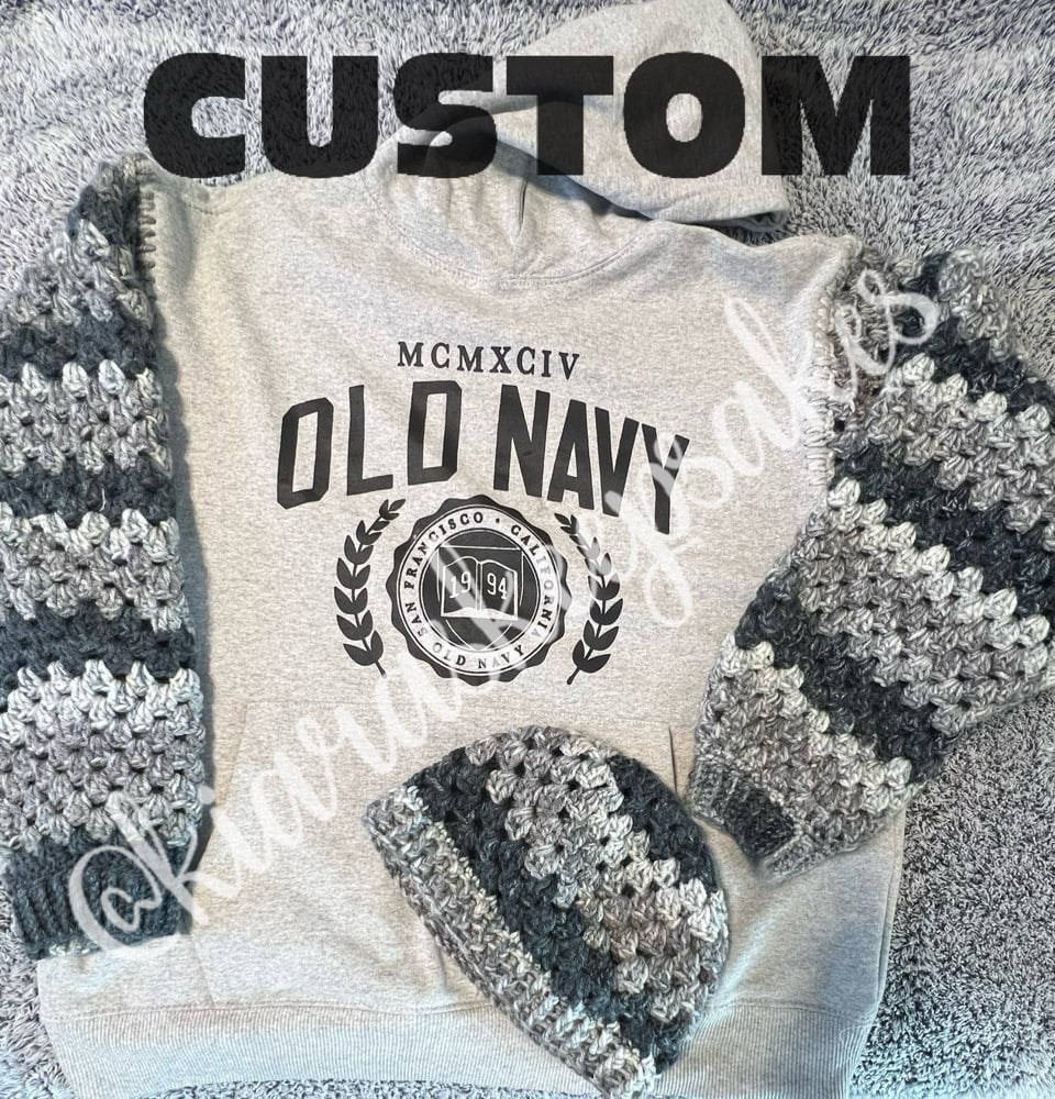 Bring your dream hoodie or crew neck to life with Freestyle / Custom sleeves—a one-of-a-kind keepsake from the Daydream Collection. Pick your favorite colors, ombre swirls, or magical combinations, and let each piece be handcrafted with love, so no two are ever the same. All customs will include a hat similar to the one pictured.